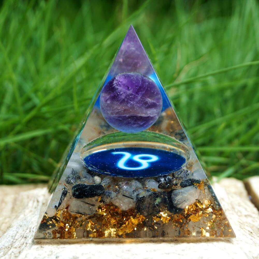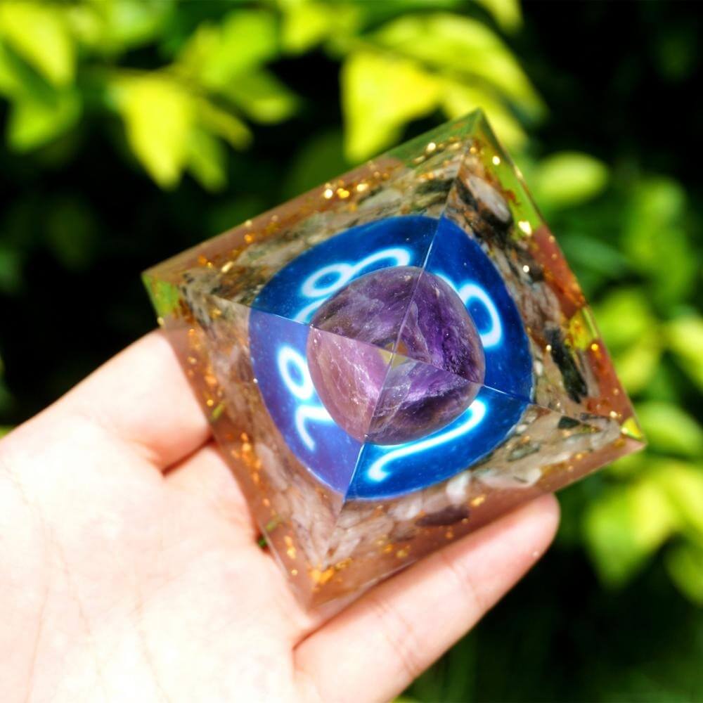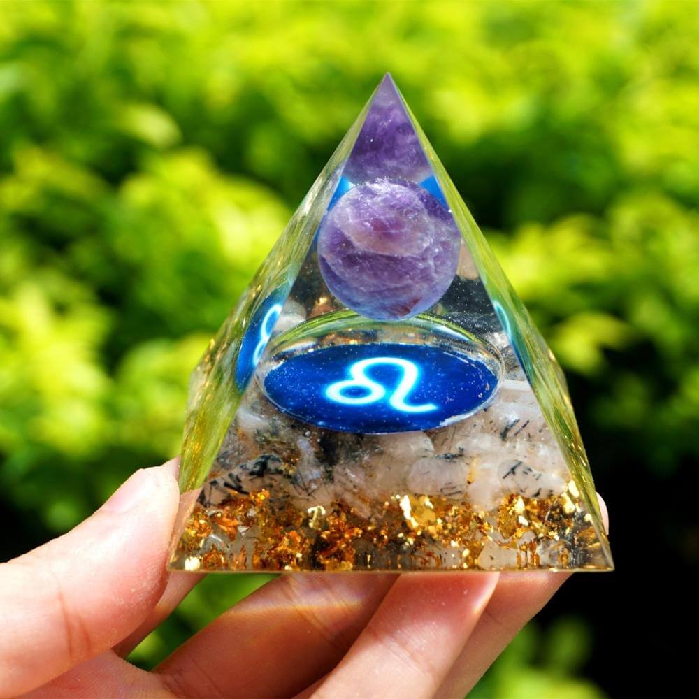 Pyramide Orgonite du Zodiaque Améthyste et Quartz Rutile Noir - Lion